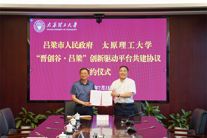 7月2日上午,我校与吕梁市人民政府在明向校区行政A座四层一号会议室举行校市合作座谈会,并签署“晋创谷·吕梁”创新驱动平台共建协议,深化校市合作,共谋发展新篇。校党委副书记、副校长(主持行政工作)孙宏斌会见吕梁市副市长任磊一行,校党委常委、副校长肖连团出席签约仪式。吕梁市相关单位负责人,我校相关部门(单位)负责人参加签约仪式。